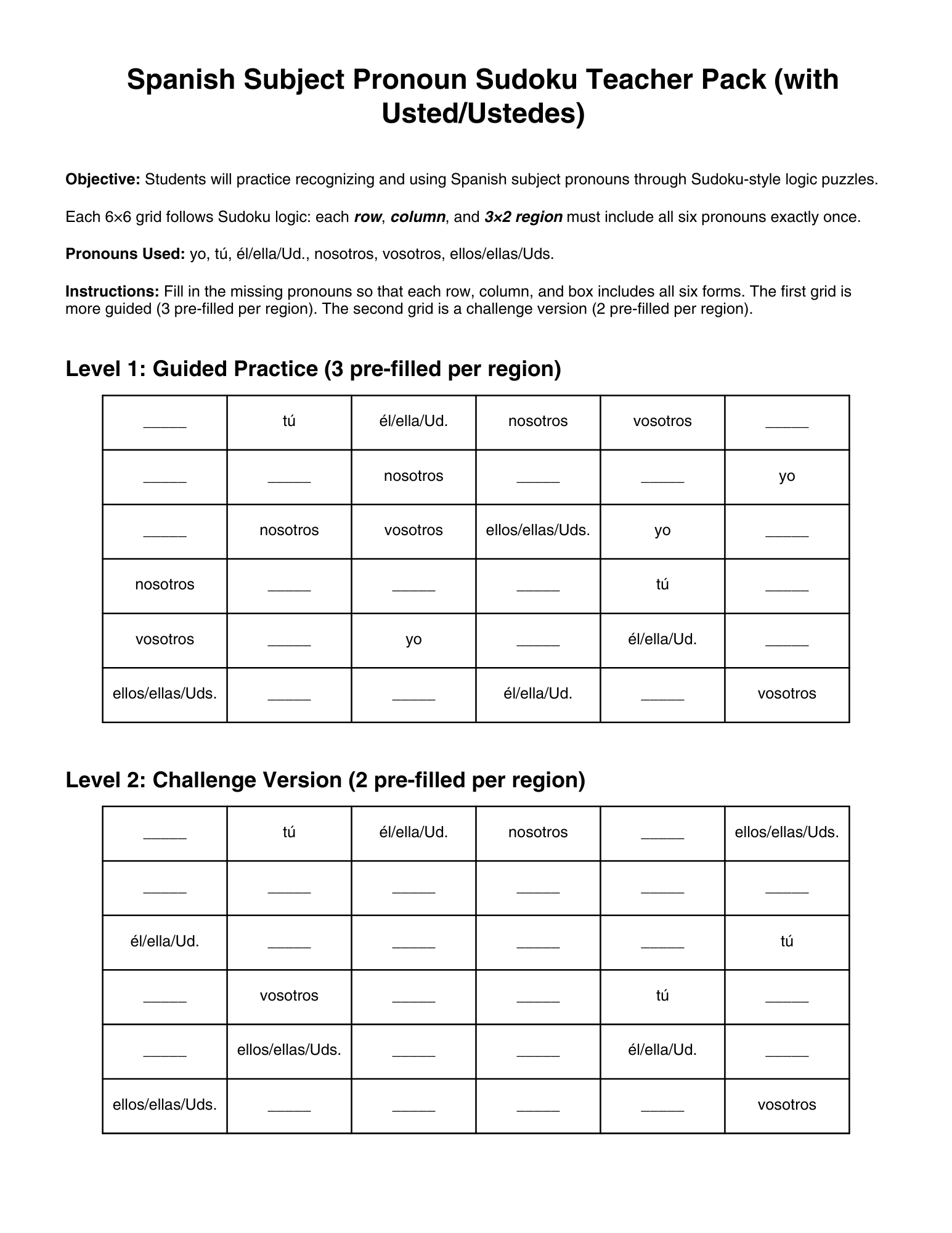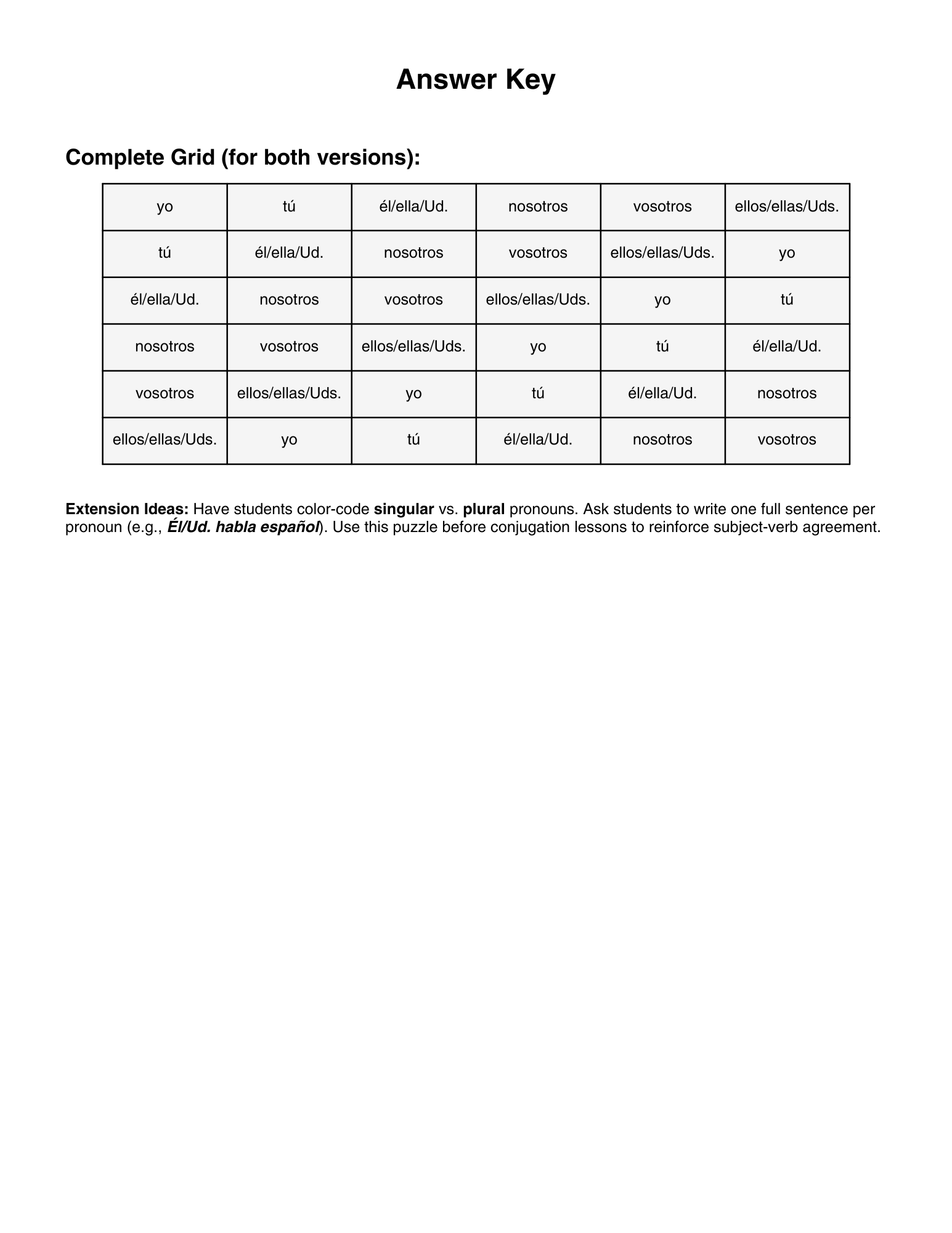 Verb Sudoku is a flexible, meaningful, and highly engaging alternative to traditional conjugation practice. It encourages students to slow down, apply logic, and see verb endings as patterns rather than memorized lists. Whether you use it once a semester or integrate it regularly into your instruction, it offers a valuable way to strengthen accuracy and confidence with Spanish verbs.