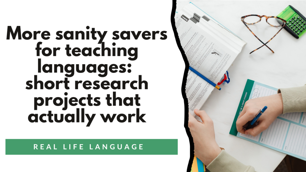 Spanish Lesson Plans, Teaching French, Teaching World LanguagesTeaching languages without burning out means keeping a toolbox of activities that are low-prep, high-engagement and culturally rich. If you want more sanity savers for teaching languages, focus on short, scaffolded research projects that fit into spare minutes and scale by proficiency level. Why short research projects matter Research projects give students purposeful reading and […]