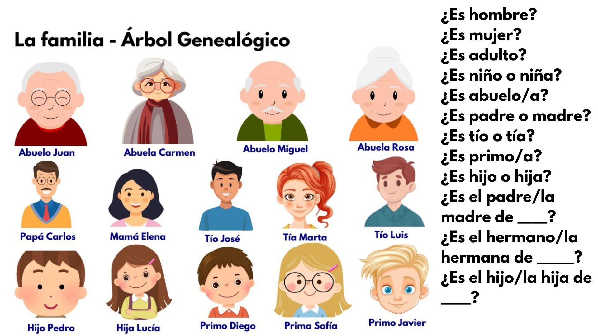- Level 2 (Intermediate): Add relationship-based questions (Is this person Pedro’s father? Is she Sofía’s cousin?).