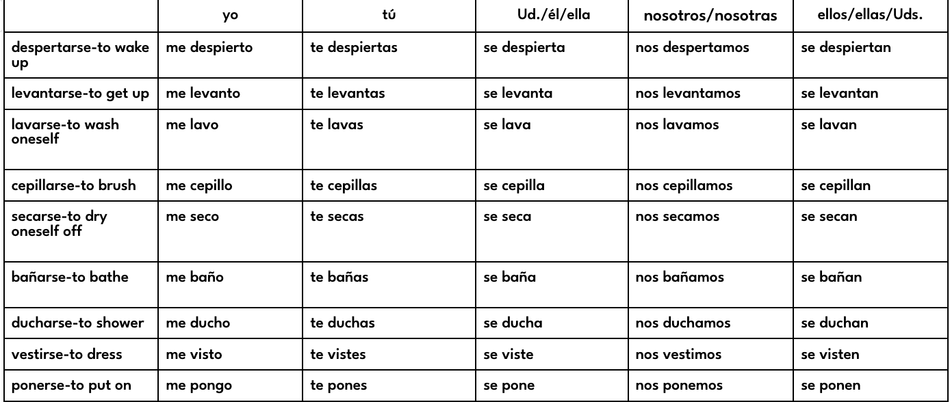 despertarse, levantarse, ducharse, vestirse, maquillarse, afeitarse, cepillarse, acostarse, relajarse, prepararse, bañarse