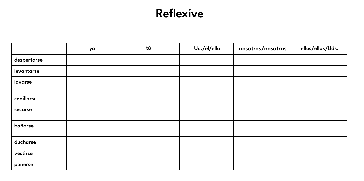 Reflexive Verb Chart included as part of assessment