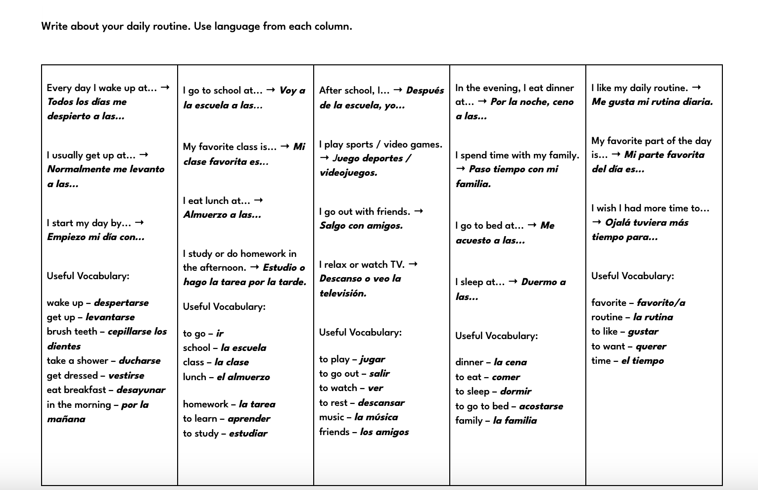Spanish 2 – Unit 1 Handout: Daily Routine, School, and Community