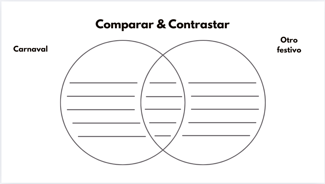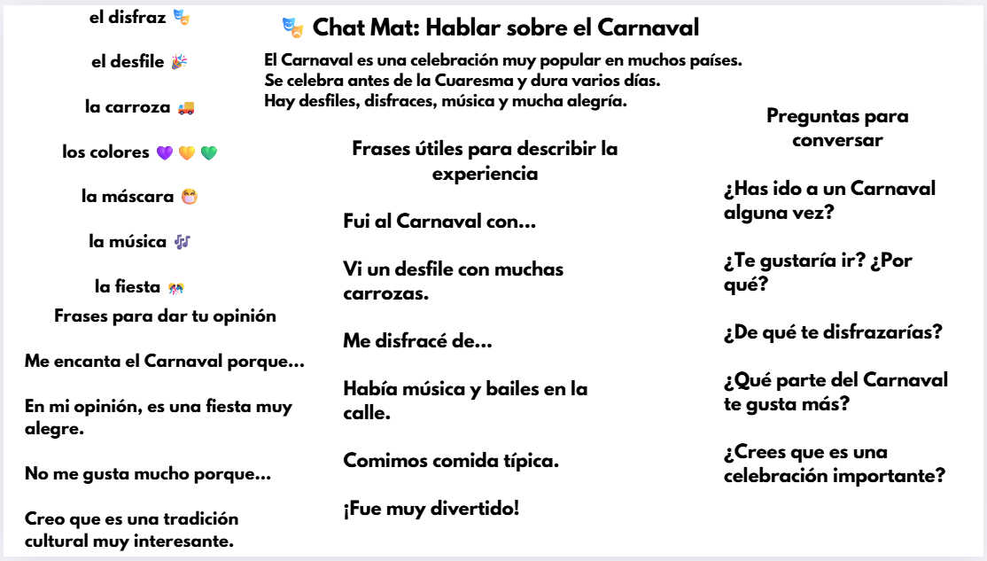 There is a chat mat to talk about Carnaval and a graphic to compare and contrast celebrations in Spanish across cultures.